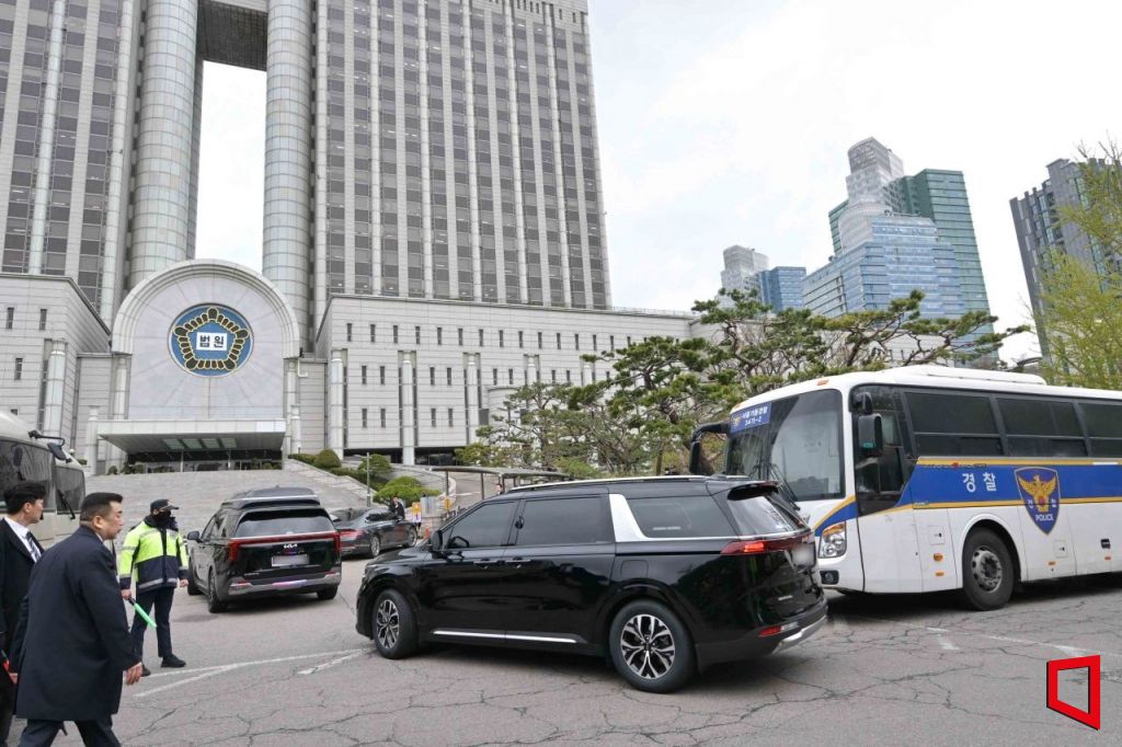 윤석열 전 대통령의 내란 혐의 첫 형사 재판이 열리는 14일 서울중앙지방법원으로 윤 전 대통령이 탑승한 차량이 들어가고 있다. 2025.4.14 사진공동취재단