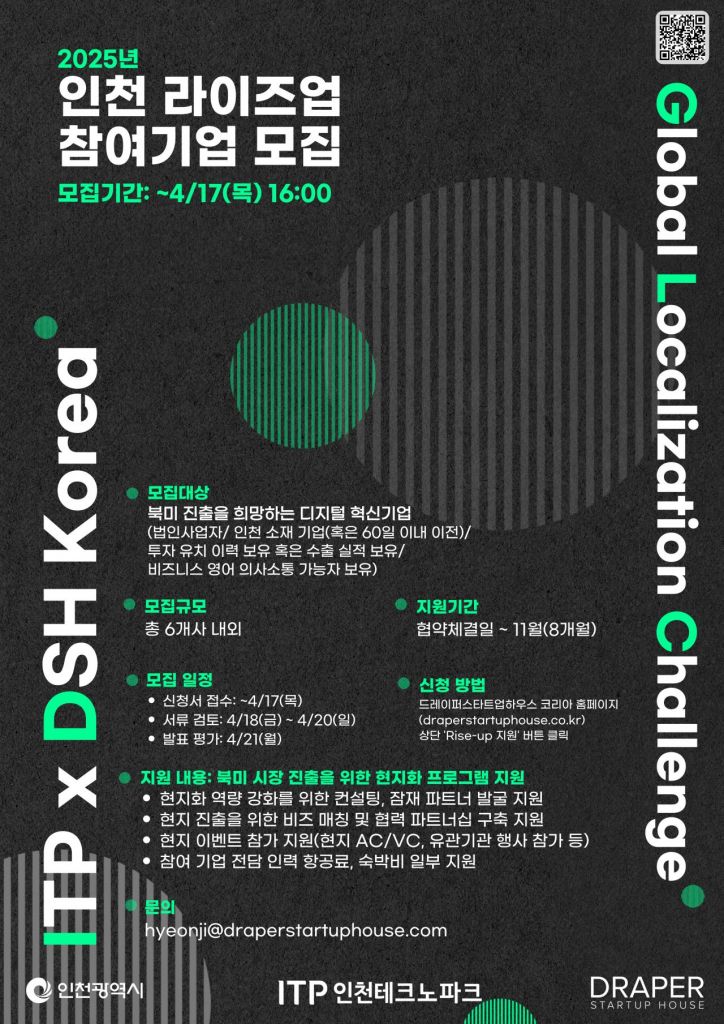 '2025년 인천 라이즈업'은 인천테크노파크(인천TP)의 '글로벌 스케일업 캠퍼스' 사업의 일환으로 북미 시장 진출에 필요한 제품 및 서비스 현지화에 어려움을 겪는 기업을 발굴, 북미 시장 진입과 현지 네트워크를 지원하는 프로그램이다.