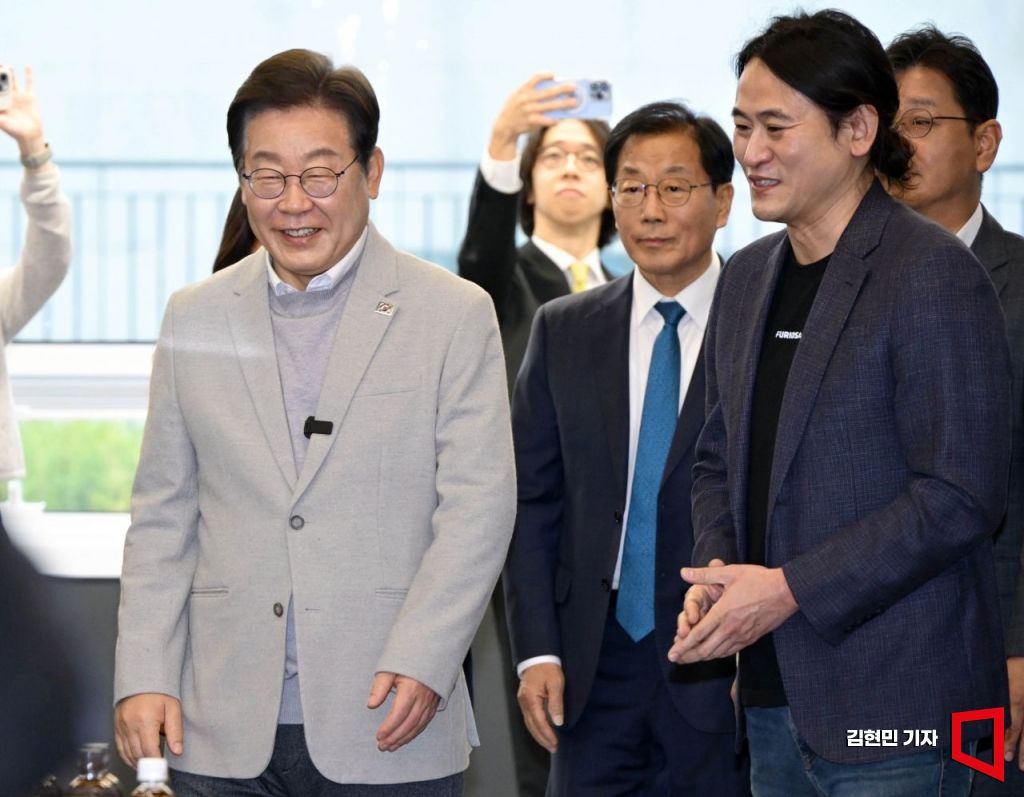 이재명 더불어민주당 대선 예비후보가 14일 서울 강남구 퓨리오사AI에서 백준호 퓨리오사AI 대표와 입장하고 있다.