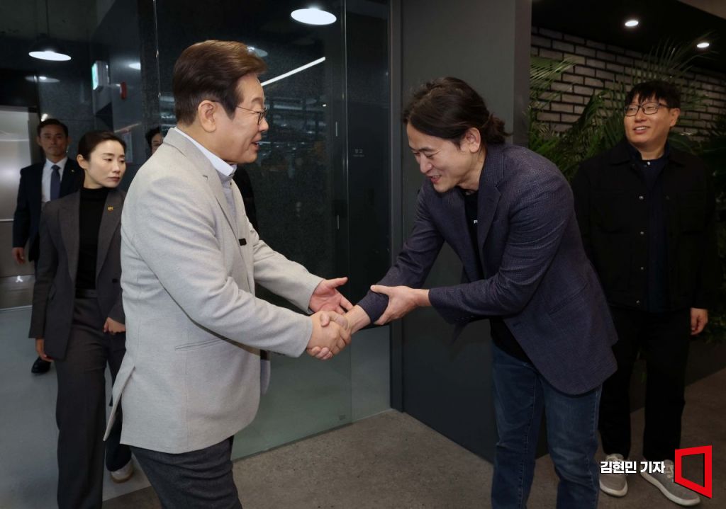 이재명 더불어민주당 대선 예비후보가 14일 서울 강남구 퓨리오사AI를 찾아 백준호 대표와 인사하고 있다. 2025.4.14 국회사진기자단