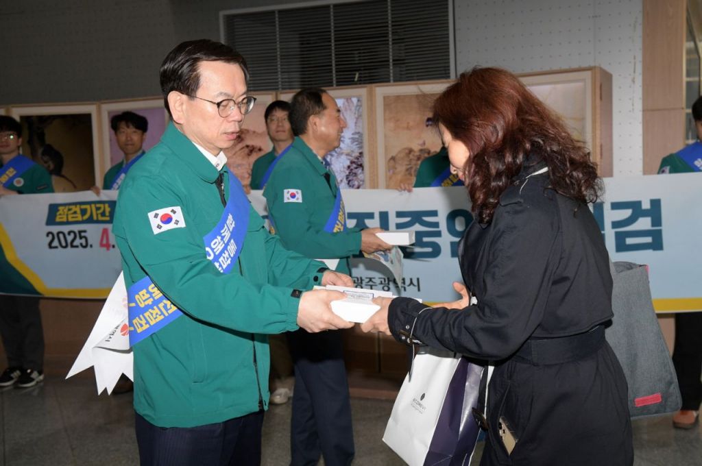 고광완 광주시 행정부시장이 14일 오전 시청 1층 출입구에서 출근하는 시 공직자를 대상으로 집중 안전점검 캠페인을 벌이고 있다. 광주시 제공