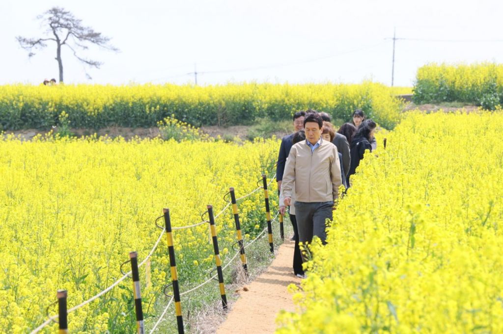 지난 10일 유채꽃 경관단지를 찾은 이강덕 포항시장. 포항시 제공