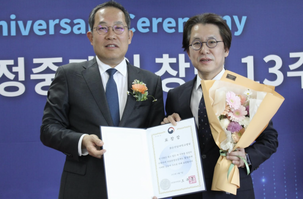 화순전남대병원 강호철 진료부원장(오른쪽)이 한국의료분쟁조정중재원 창립 13주년 기념식에서 보건복지부장관 단체표창을 받고 있다. 화순전남대병원 제공