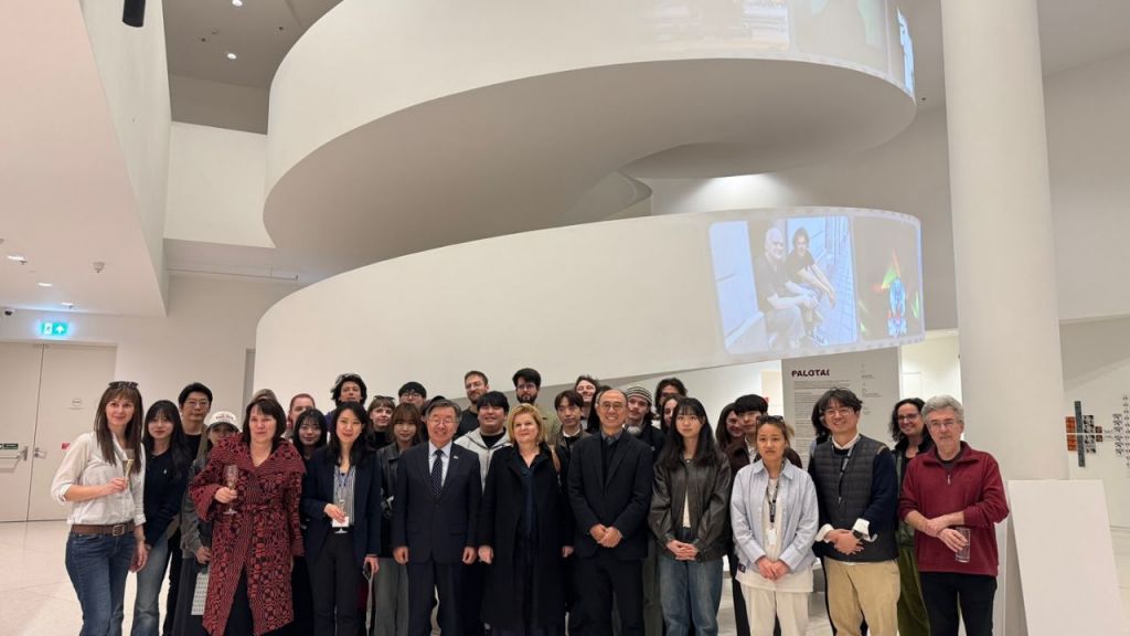 행사 종료 후 주요 인사들과 참가 학생들의 단체 사진(우측 5번째 위정현 학장 왼쪽으로 마테이데스 레카 Matheidesz Reka MOME CEO, 홍규덕 주헝가리 한국대사, 유혜령 주헝가리 한국문화원장. <사진=중앙대 제공>