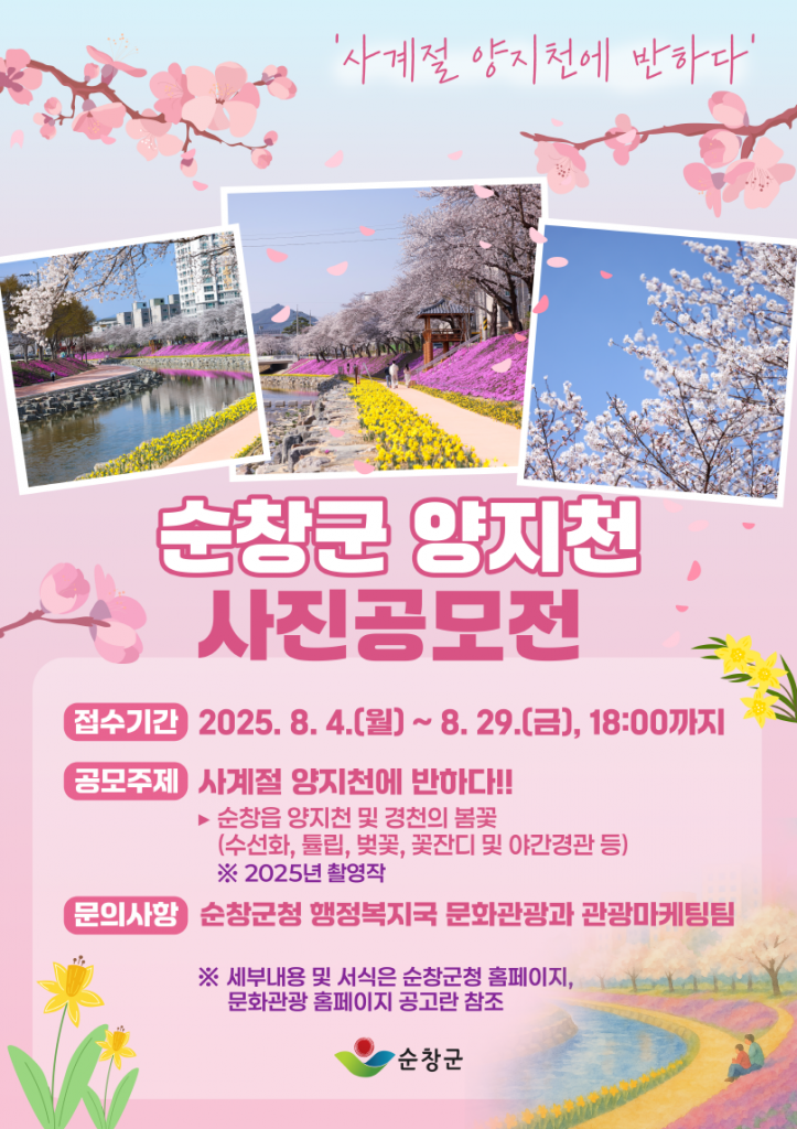 공모전은 오는 8월 4~29일 접수가 진행되며, 지역과 연령에 제한 없이 순창군에 관심이 있는 누구나 참여할 수 있다. 특히 현재 양지천 일대에는 꽃잔디와 튤립, 수선화 등 봄꽃이 절정을 이루고 있어, 참가자들이 사전에 작품 촬영을 준비하기에 최적의 시기다.