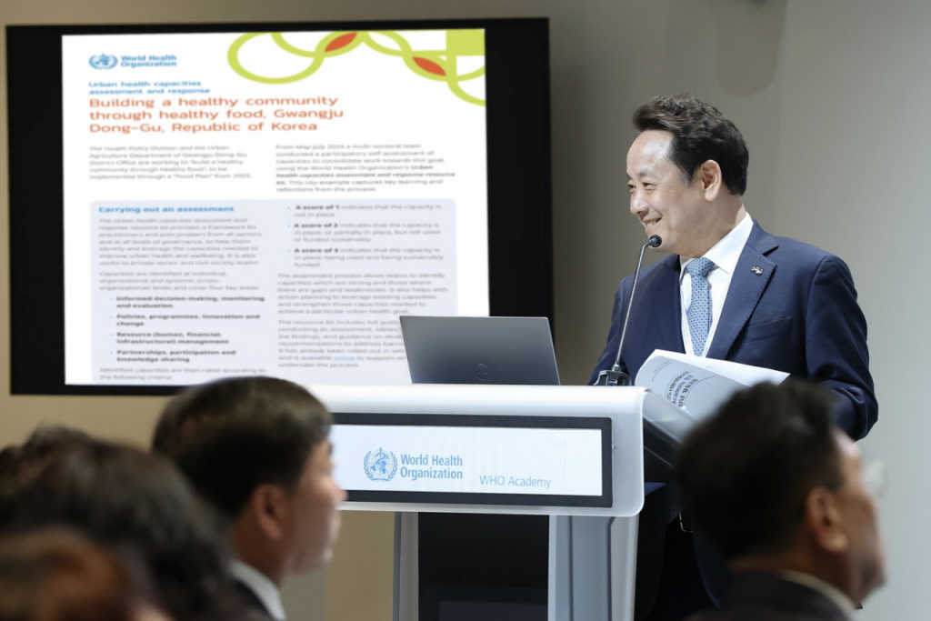 광주 동구가 최근 스위스 제네바에서 열린 대한민국건강도시협의회 정책 리더십 아카데미에서 동구 도시 건강역량평가 정책이 세계보건기구로부터 높은 평가를 받았다. 광주 동구 제공