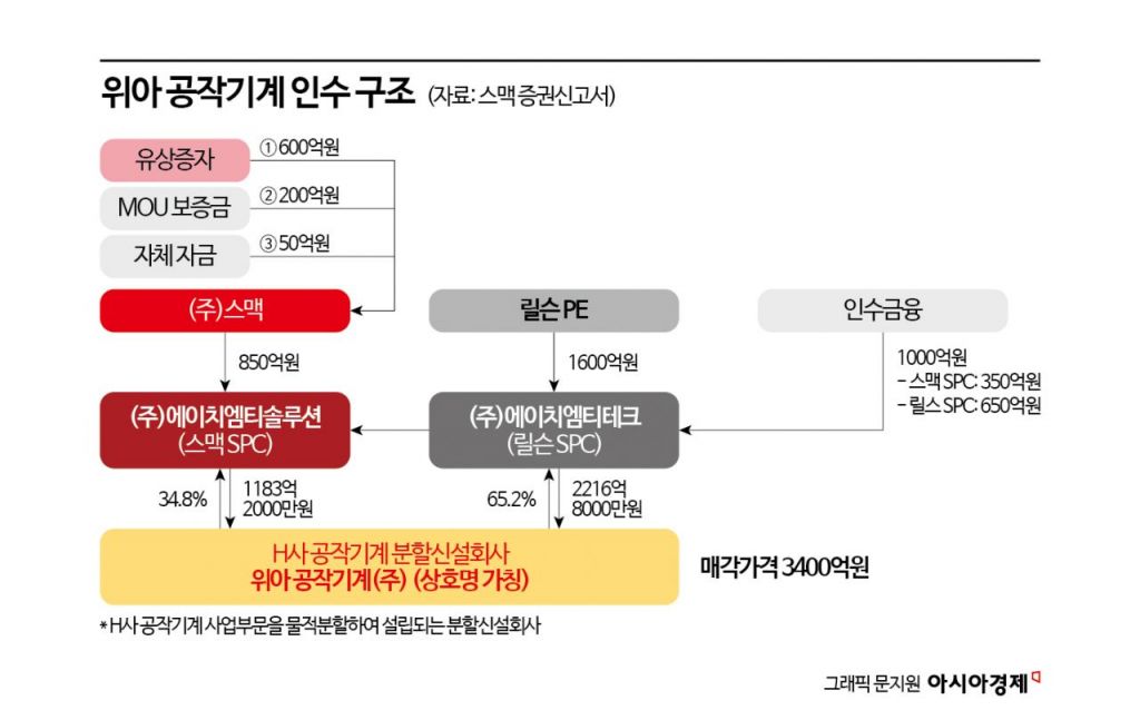 앞서 스맥은 위아 공작기계 인수와 관련해 지난해 10월 매도인측과 인수 양해각서(MOU)를, 지난달 18일 본 계약을 체결했다. 전체 매매대금 3400억원 가운데 스맥은 1183억원을 부담하고 지분 34.8%를 취득한다. 재무적 투자자인 릴슨프라이빗에쿼티(PE)가 나머지 2217억원을 출자하기로 했다.