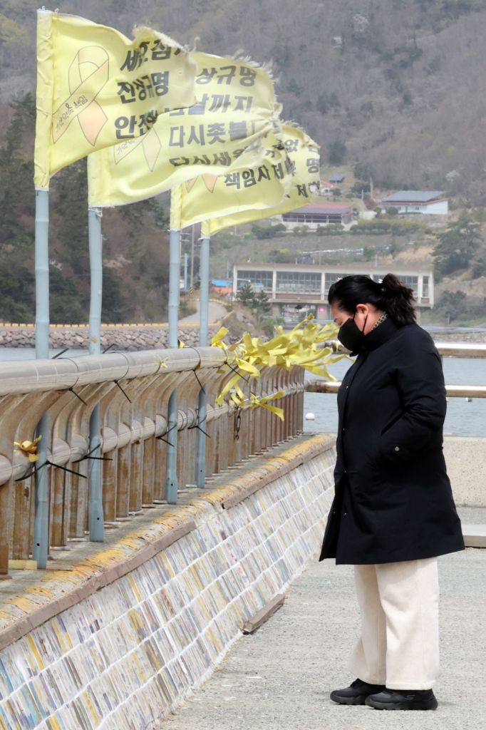 세월호 참사 11주기를 이틀 앞둔 14일 전남 진도군 임회면 연동리 팽목항에서 한 시민이 추모 공간을 둘러보고 있다. 연합뉴스