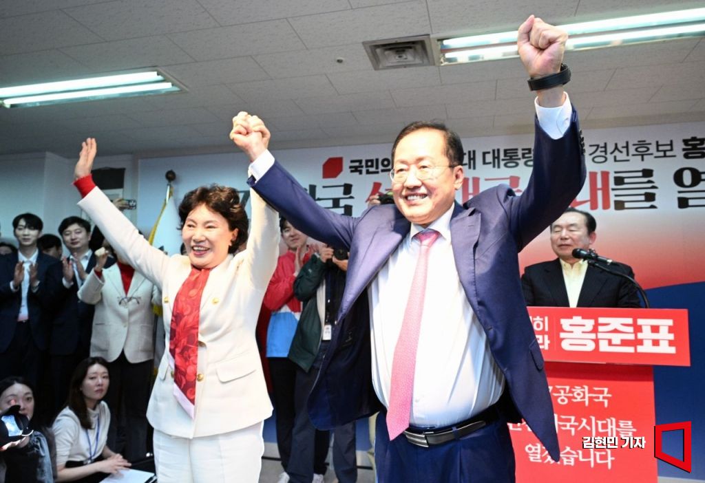 홍준표 전 대구시장이 14일 서울 여의도 대하빌딩 캠프 사무소에서 제21대 대통령 선거 출마 선언을 하며 부인 이순삼 씨와 함께 손을 들어보이고 있다.