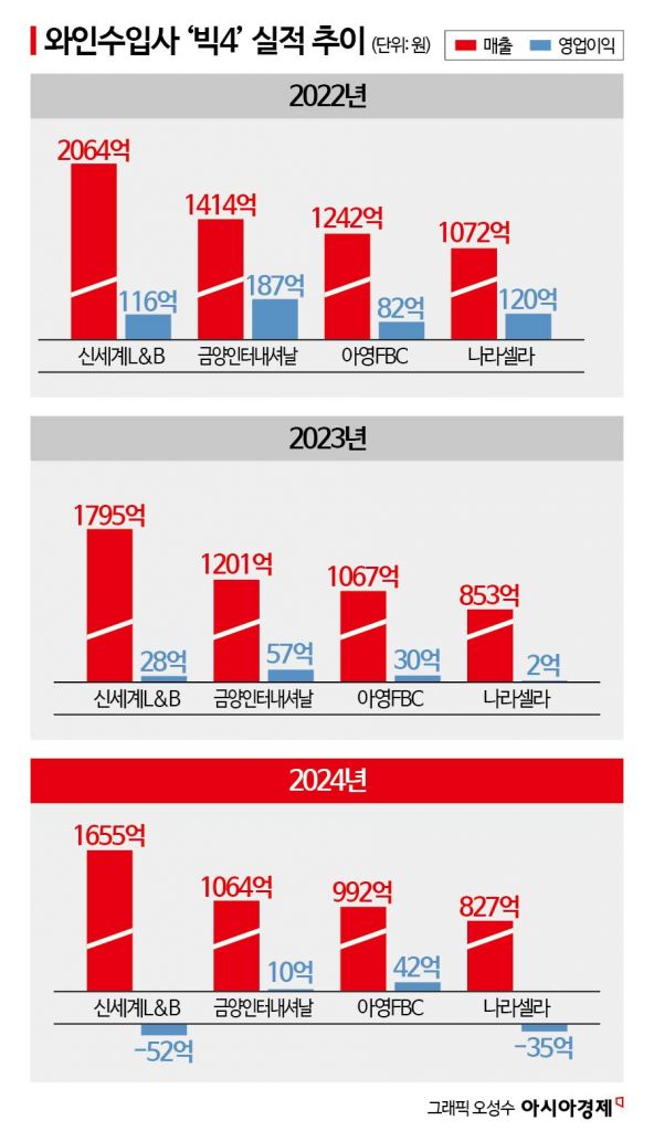 지난해 국내 와인 수입사들의 몸집이 예외 없이 쪼그라들었다. 경기 침체로 인한 소비 둔화 등으로 와인 수요가 줄면서 매출 감소를 피하지 못한 것이다. 내수 경기 둔화가 여전한 가운데 글로벌 관세 전쟁 등으로 올해도 쉽지 않은 한 해가 예상되는 가운데 업체들은 적극적인 고정비 관리와 시장 맞춤형 포트폴리오 전략 등을 통해 수익성 개선에 나선다는 전략이다.