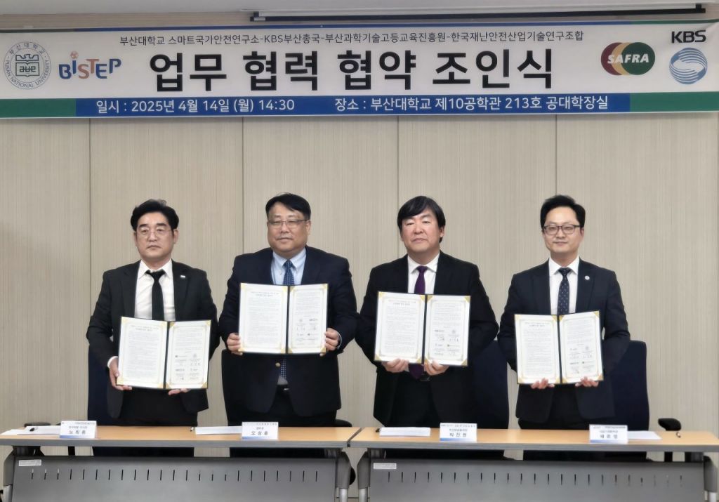 부산대학교(총장 최재원)는 14일 공과대학에서 KBS부산총국, 부산과학기술고등교육진흥원, 한국재난안전산업기술연구조합과 안심사회 도약 발판을 마련하고자 국가연구소(NRL 2.0) 사업 선정과 부산대 '스마트국가안전연구소' 설립을 위한 업무협약을 체결했다.