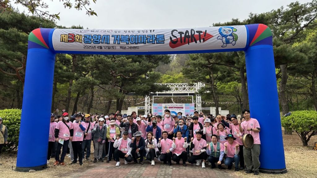 지난 12일 광양시 백운그린랜드에서 개최된 '제3회 광양시 거북이 마라톤' 출발지점에서 정인화 광양시장, 박성현 YGPA 사장을 비롯한 참여자들이 함께 기념촬영을 하고 있다. 여수광양항만공사 제공