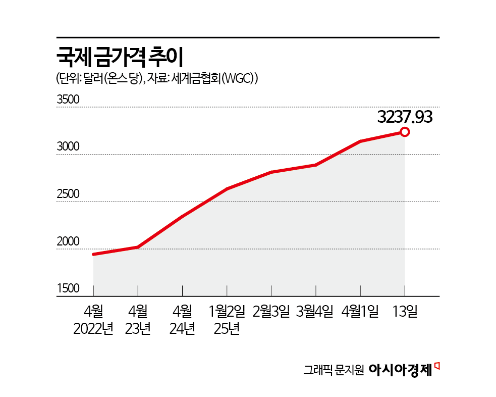15일 세계금협회(WGC)에 따르면 지난 13일 온스당 금 가격은 3237.93달러를 기록했다. 이는 역대 최고가로, 1년 사이 약 40% 올랐다. 금 가격은 트럼프 행정부가 들어선 이후 가파르게 상승하고 있다. 특히 지난 2일(현지시간) 상호관세 조치를 발표한 이후 불과 일주일 사이 4%가 올랐다.