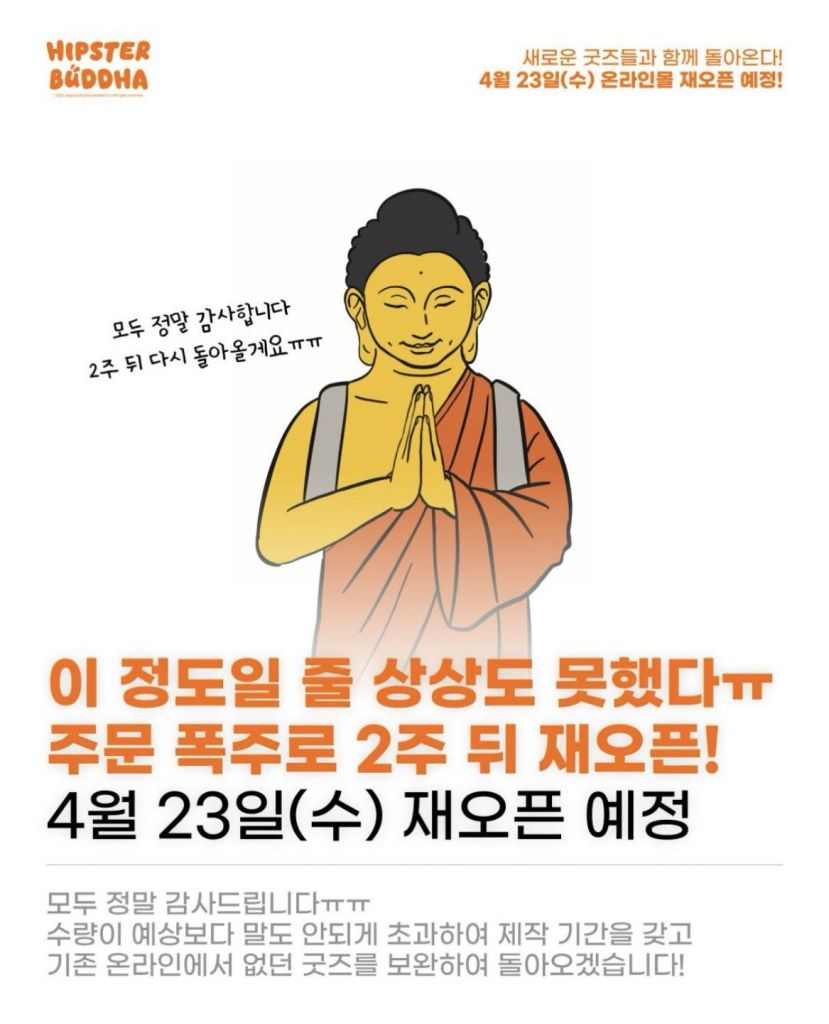 부처님이 그려진 티셔츠를 판매하는 쇼핑몰의 주문 폭주 공지. 인스타그램 캡처.