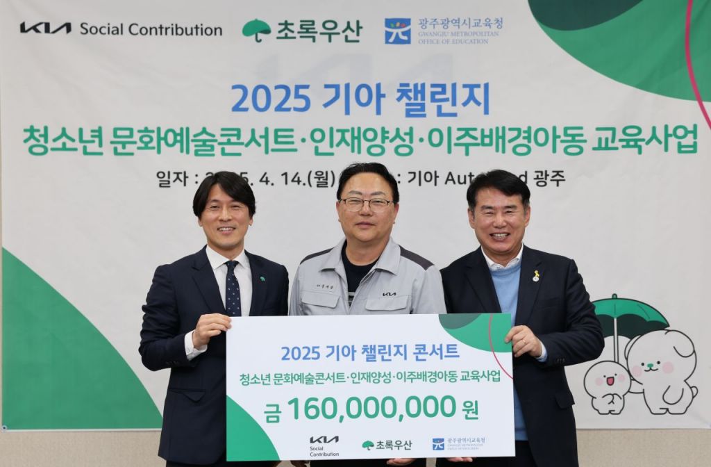 이날 행사는 기아 오토랜드광주에서 진행됐으며, 문재웅 공장장이 이정선 광주시교육감과 변정근 초록우산어린이재단 본부장에게 후원금 1억6,000만원을 전달했다.