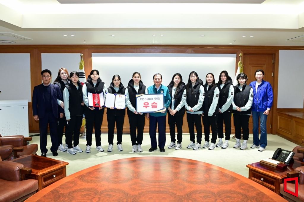 김천시청 여자농구단이 2025년 첫 대회 우승으로 배낙호 김천시장 집무실에서 기념촬영 하고 있다.