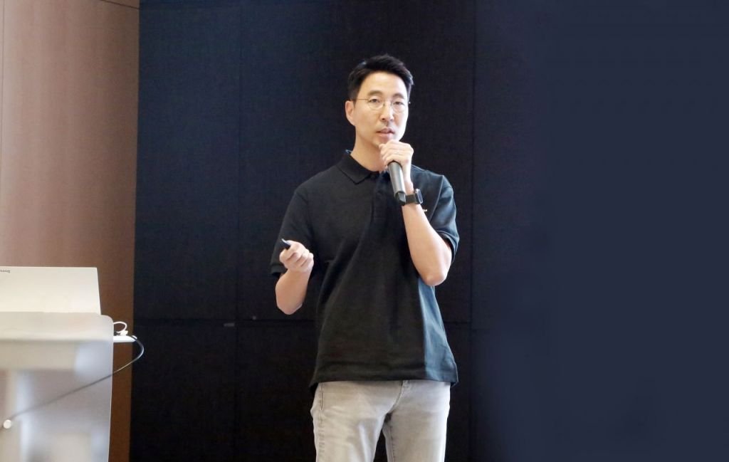 김민표 두산로보틱스 대표가 최근 경기 성남시 분당두산타워에서 열린 타운홀 미팅에서 발언하고 있다. 두산로보틱스