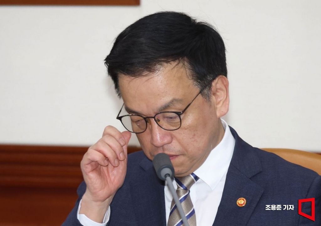 최상목 경제부총리 겸 기획재정부 장관이 15일 서울 종로구 정부서울청사에서 열린 경제관계장관회의 겸 산업경쟁력강화 관계장관회의에 참석, 미 관세부과 조치에 따른 대응 방안, 생각에 잠겨 있다.