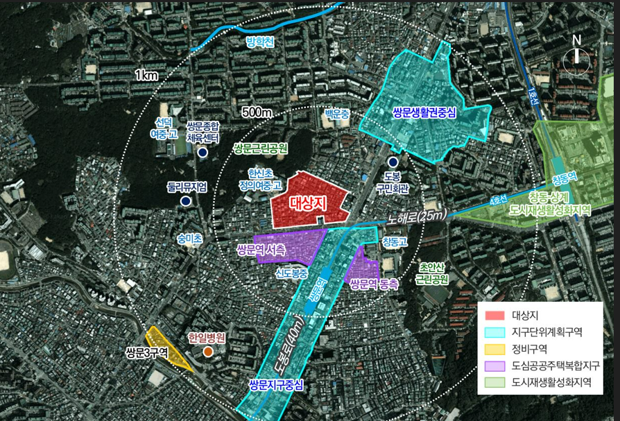 우선 대상지 인근에서 여러 개발사업이 진행되고 있다는 고려해 용도지역 상향(제2종 7층/제2종→3종)과 경관계획을 수립했다. 쌍문역을 중심으로 도심공공주택복합화사업 2개소가 진행 중이며 1㎞ 반경 내 창동, 상계 도시재생활성화지역에서 대규모 개발이 추진된다는 입지적 특성을 반영했다.