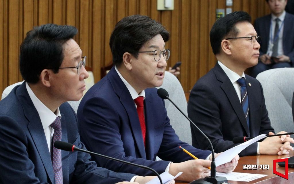 권성동 국민의힘 원내대표가 15일 국회에서 열린 원내대책회의에서 발언하고 있다.