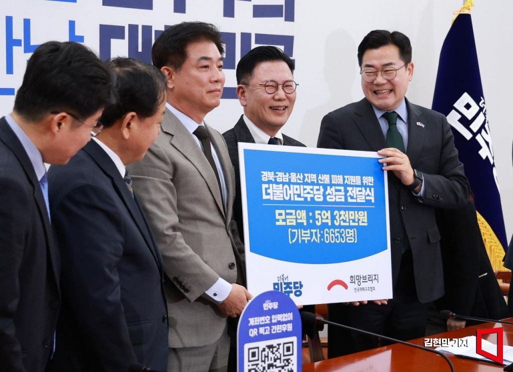 박찬대 더불어민주당 대표 직무대행 겸 원내대표(맨 오른쪽)가 15일 국회에서 신훈 희망브리지 전국재해구호협회 사무총장(오른쪽 두 번째)에게 경북·경남·울산 지역 산불 피해 지원을 위한 성금을 전달하고 있다. 2025.4.15 김현민 기자