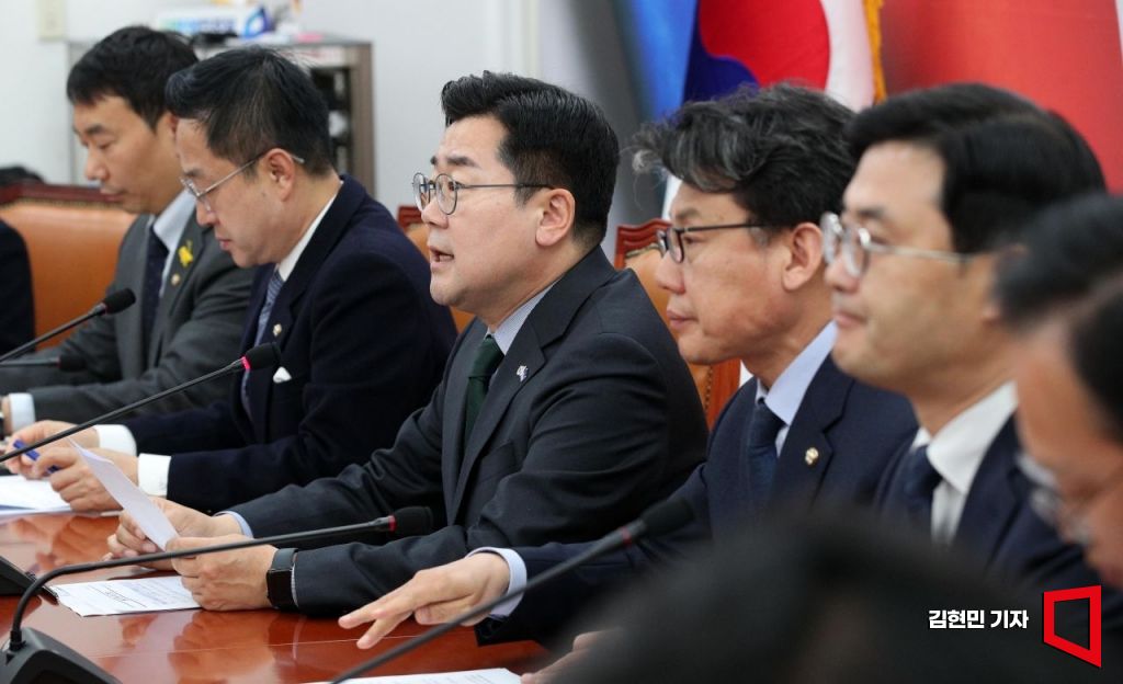 박찬대 더불어민주당 당대표 직무대행 겸 원내대표가 15일 국회에서 열린 원내대책회의에서 발언하고 있다.