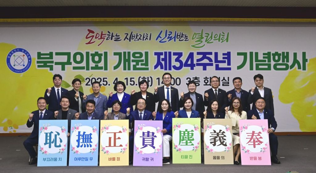 행사는 최무송 북구의회의장의 기념사를 시작으로, 광주시장과 시의회 의장, 국회의원, 자매의회 대표 등의 축사가 이어졌다. 최 의장은 "구민과 함께한 34년을 기념하는 뜻깊은 자리에 함께해 주셔서 감사드린다"며 "앞으로도 소통과 청렴을 바탕으로 주민 중심의 의회를 만들겠다"고 밝혔다.