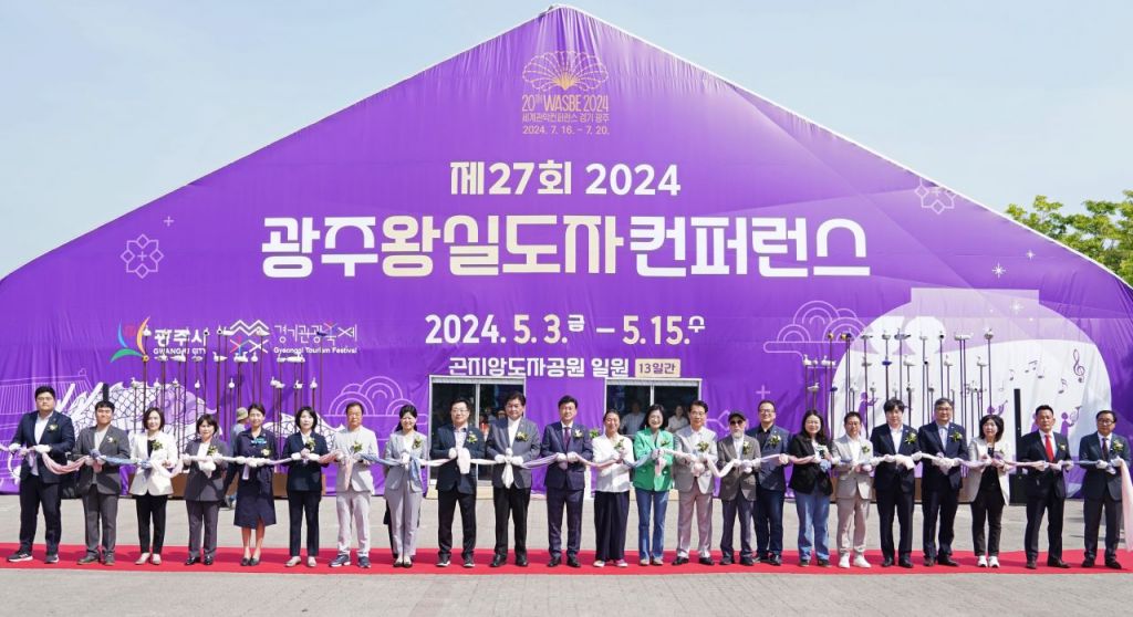 광주의 대표적인 봄 축제 '제28회 광주왕실도자페스티벌'이 오는 25일부터 5월 6일까지 12일간 곤지암도자공원 일원에서 다채로운 행사와 함께 개최된다. 사진은 지난해 열린 '광주왕실도자컨퍼런스' 개막식에서 테이프 커팅을 하고 있는 모습. 경기 광주시 제공