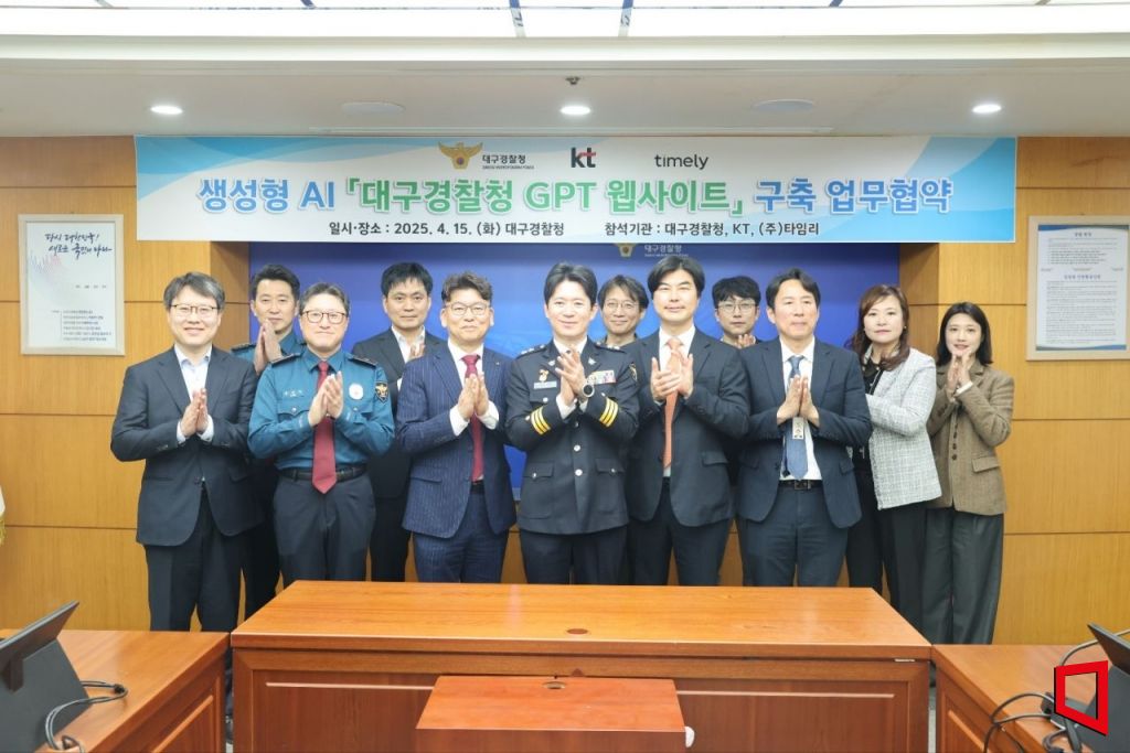 대구경찰청은 15일 청사 7층 회의실에서 KT 대구경북법인고객본부, ㈜타임리와 함께 '경찰 GPT 웹사이트 구축을 위한 업무협약을 체결했다고 밝혔다.