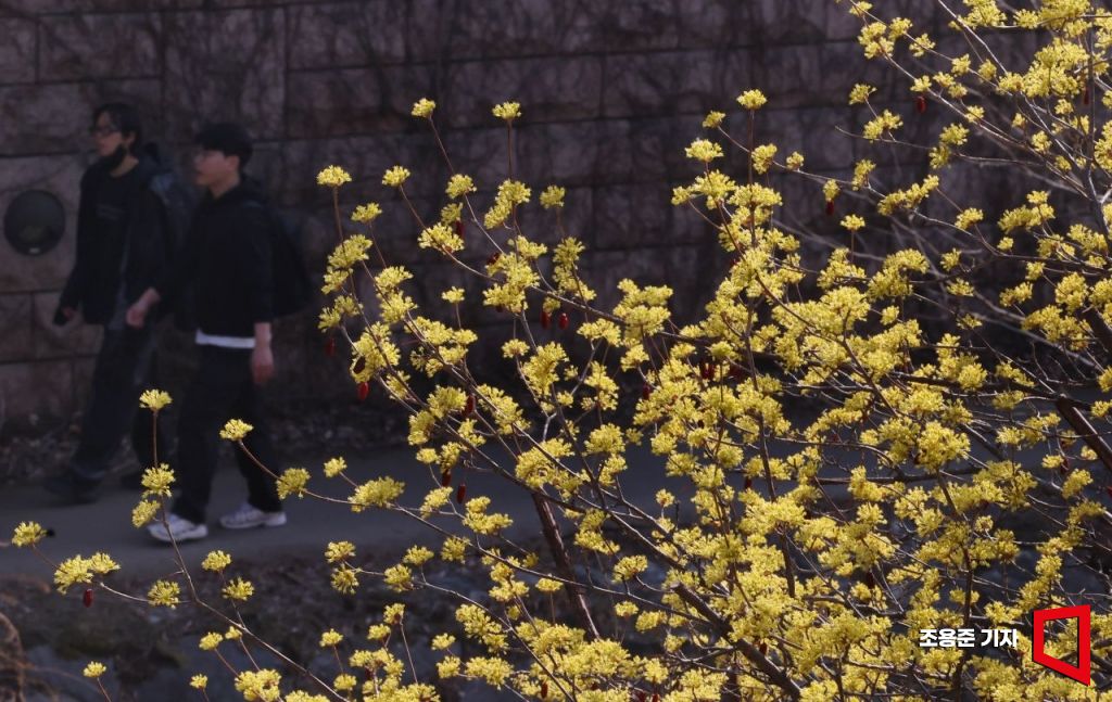 완연한 봄 날씨를 보인 지난달 21일 서울 청계천에 활짝 핀 산수유를 보며 시민들이 산책을 즐기고 있다.