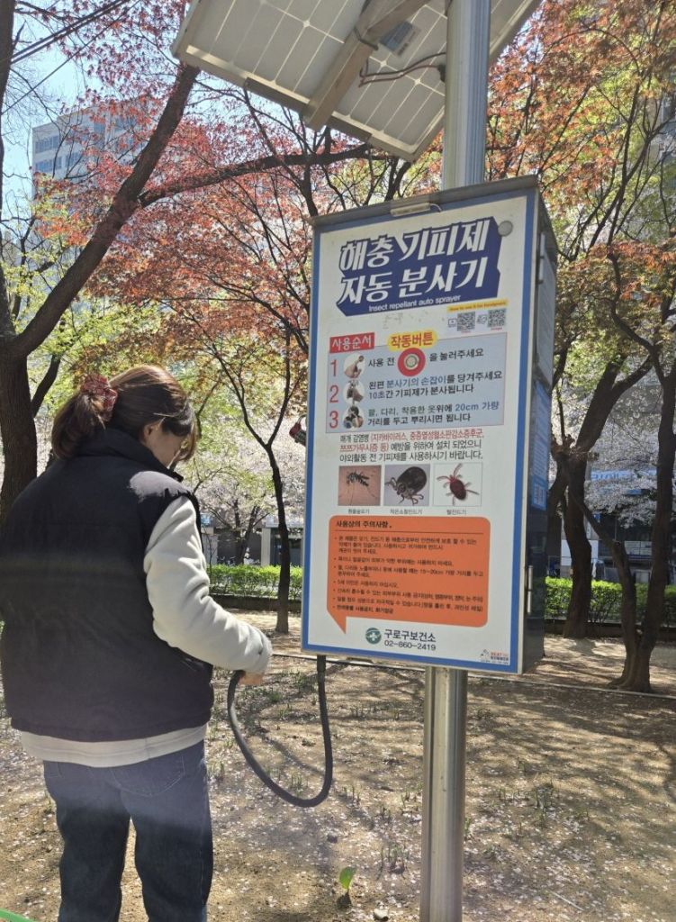 아울러, 추가 설치지역을 포함한 △천왕산 가족캠핑장 관리사무소 앞 △천왕산 (구)근린공원 화장실 앞 △개웅산 근린공원 등산로 입구 화장실 주변 △안양천 벚꽃길 구현 전망대 △거리공원 1·2구역 화장실 주변 먼지털이기 옆 △고척 근린공원 화장실 주변 △매봉산 잣절공원 화장실 주변 먼지털이기 옆 △오금어린이공원 입구 좌측 △동양미래대앞 교차로 부근 안양천 진입로 등 18곳의 해충기피제 분사기는 오는 11월까지 운영한다.
