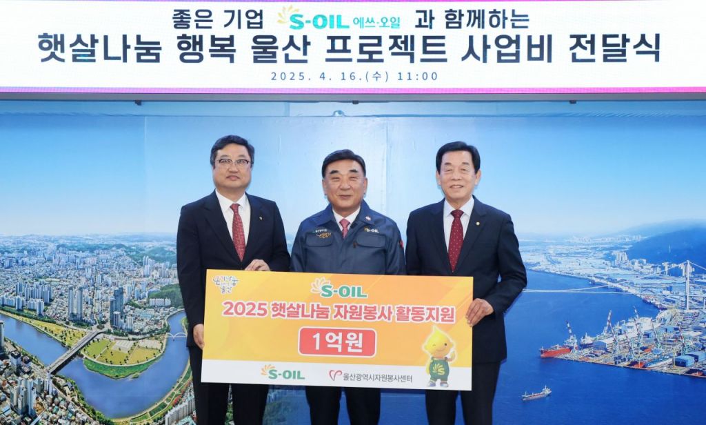 S-OIL은 16일 울산시청에서 김두겸 울산시장, 김보찬 S-OIL 부사장, 이상식 울산시자원봉사센터 이사 등이 참석한 가운데 '햇살나눔 자원봉사 활동비' 1억원을 울산시자원봉사센터에 전달했다.