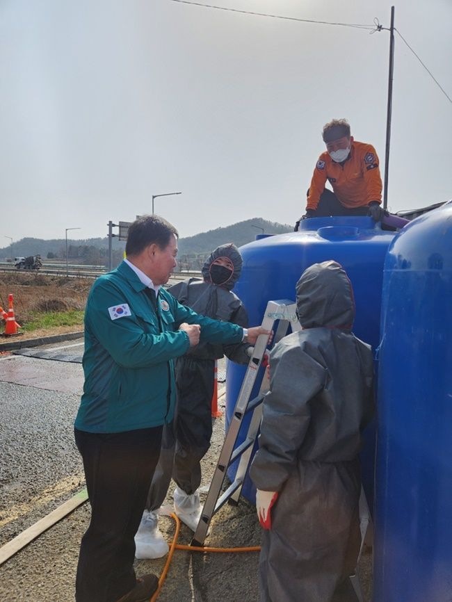 군은 즉시 발생농장과 주요 도로에 통제초소를 9개소로 확대 운영하고, 드론 공동방제단과 제설차량까지 투입해 방역대 집중 방역을 실시하고 있다.