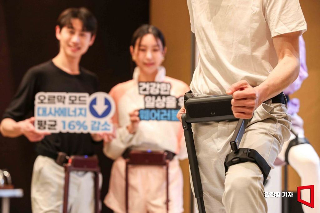 16일 서울 중구 그랜드 하얏트 호텔에서 홍보 모델들이 위로보틱스 웨어러블 로봇 'WIM S'를 착용하고 있다. CES에서 2년 연속 혁신상을 수상한 위로보틱스가 이번에 선보이는 WIM S는 초경량 인체공학 설계와 AI 기반 보행보조 기능을 통해 안정적이고 효율적인 이동을 돕는 보행보조 웨어러블 로봇이다.