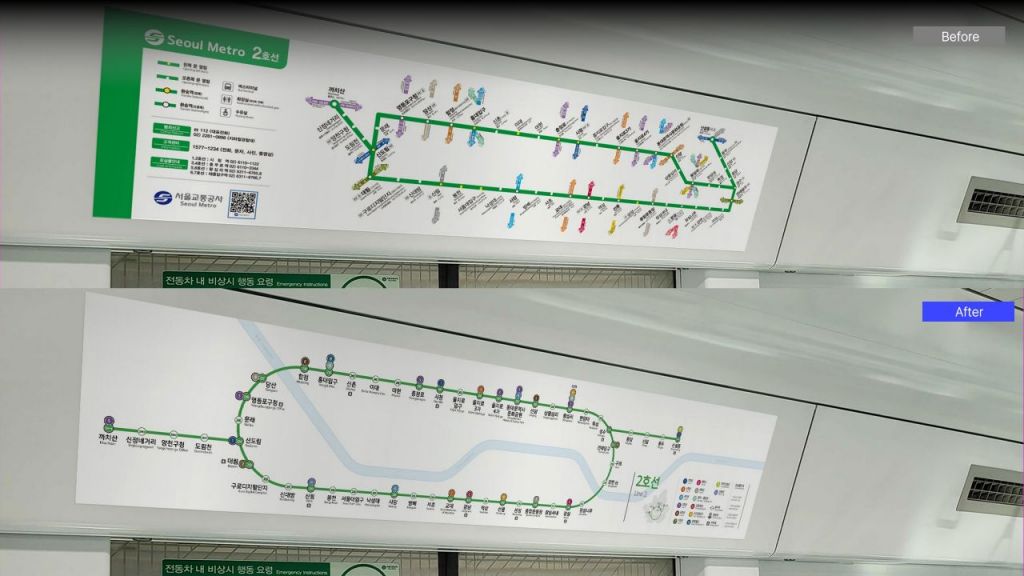 서울시는 1~9호선 단일노선도를 전면 재디자인해 올해 하반기부터 순차적으로 부착할 예정이라고 16일 밝혔다. 신형 단일노선도는 가로형, 세로형, 정방형의 3가지 형태다. 자문에 참여한 정진열 국민대 AI 디자인학과 교수는 "개선된 디자인의 단일노선도를 통해 내국인은 물론 외국인들의 지하철 이용 편의가 높아질 것"이라고 했다.