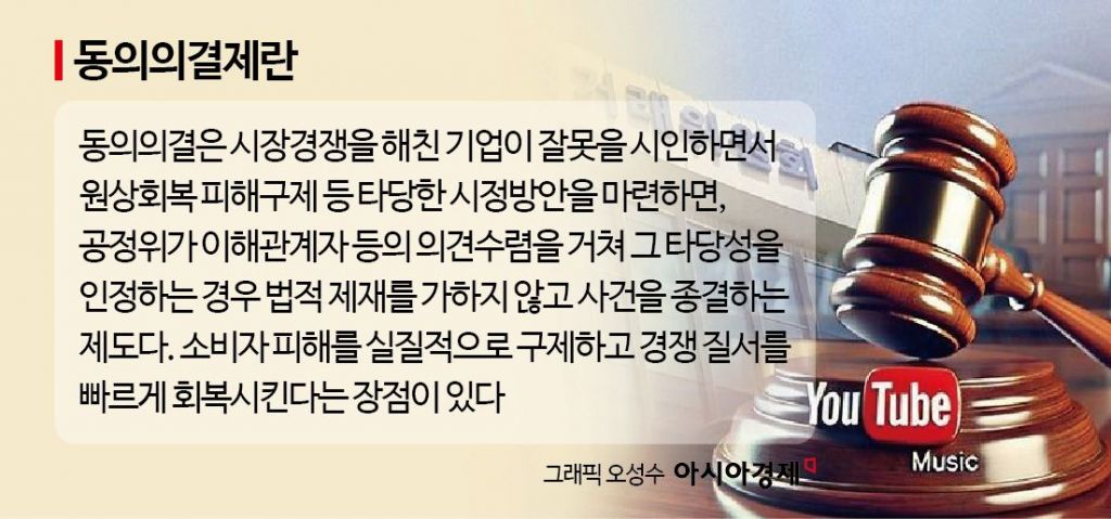 16일 업계에 따르면 구글은 최근 유튜브 뮤직 끼워팔기 의혹에 대한 시정조치안을 마련해 공정위에 동의의결 절차 개시 여부를 타진 중이다. 공정위는 향후 제출될 시정방안을 포함한 동의의결 절차의 인용 여부를 전원회의를 열어 판단하게 된다. 전원회의를 통해 동의의결 절차 개시가 인용되면 사건은 조기 종결되고 위법성 여부도 판단하지 않는다. 구글이 충분히 타당한 시정방안을 마련해 제시할 경우 다음 달 전원회의 열 가능성도 있다.