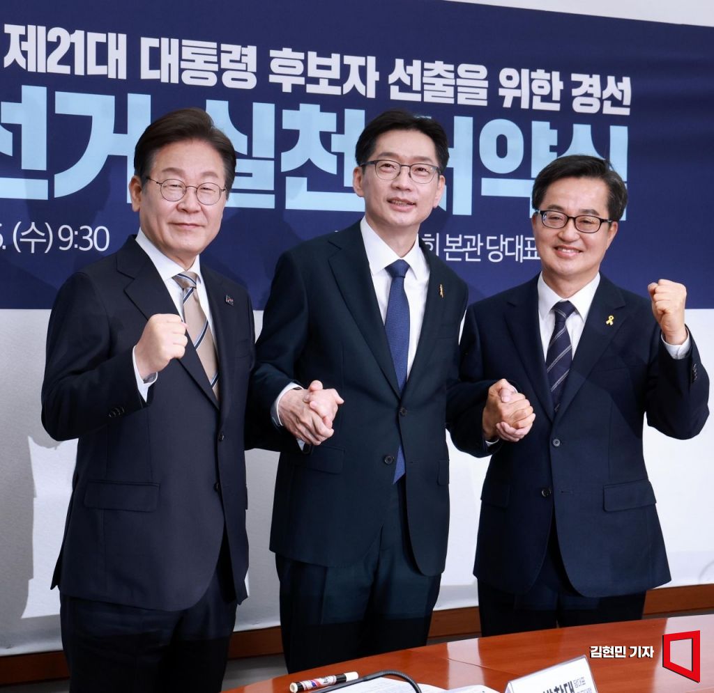 16일 오전 민주당은 여의도 국회 당대표회의실에서 민주당 21대 대통령 후보 선출을 위한 경선 공명선거 실천 서약식을 열었다. 서약식에는 박찬대 당 대표 직무대행 겸 원내대표, 박범계 중앙당선거관리위원장과 경선 후보자인 이 전 대표, 김 전 지사, 김 지사 등이 참석했다. 박 직무대행은 "무도한 내란 세력을 확실히 심판하고 이번 대선에서 승리하는 게 국민과 나라가 처한 위기를 극복하기 위한 선결 과제"라며 "세 분의 후보들께서는 대한민국의 미래와 국민 삶을 위해 치열하면서도 품위 있는 선거를 펼쳐주시기를 당부드린다"고 밝혔다.