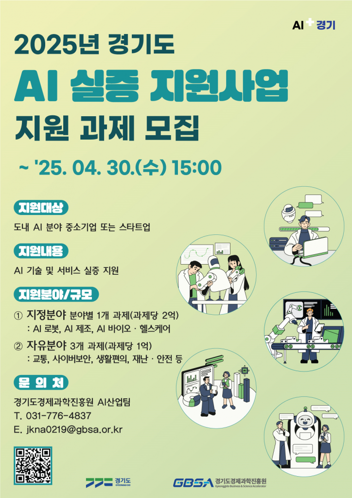 지원을 희망하는 도내 AI 관련 중소기업은 경기기업비서 누리집 공고문을 참조해 오는 30일 오후 3시까지 전자우편(jkna0219@gbsa.or.kr)으로 신청서를 제출하면 된다.