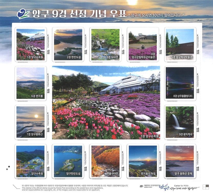 강원특별자치도 양구군(군수 서흥원)은 16일, 지역 대표 관광 명소인 ‘양구 9경’ 재정비를 기념해 ‘양구 9경 선정 기념우표’를 제작해 본격적인 판매에 들어간다고 밝혔다.