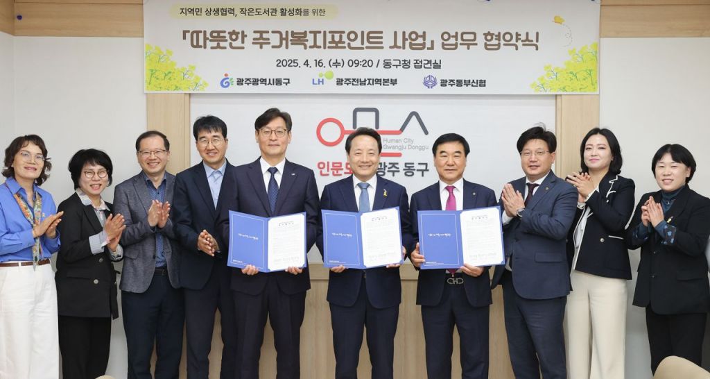 광주 동구(청장 임택)는 LH 광주전남지역본부·광주동부신협과 작은 도서관 활성화를 통한 공동체 활동 제고를 위해 '따뜻한 주거 복지 포인트 사업' 업무 협약을 체결했다고 16일 밝혔다.