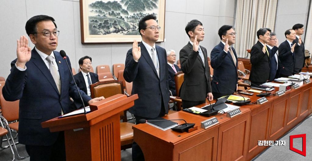 최상목 부총리 겸 기획재정부 장관 등이 16일 국회 법제사법위원회에서 열린 '기획재정부 장관 최상목 탄핵소추사건 조사' 청문회에서 선서하고 있다.