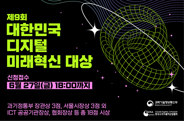 과기정통부가 주최하고 한국소프트웨어산업협회가 주관하는 '제9회 대한민국 디지털 미래혁신대상' 출품작 공모가 본격적으로 시작됐다. 본 공모는 디지털 기술을 통해 사회와 산업 전반의 구조를 혁신한 모범 사례를 발굴하기 위한 것으로, 올해 주제는 '경계를 넘는 혁신'이다.