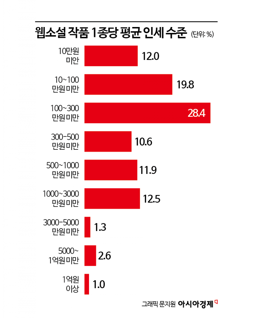 문화체육관광부와 한국출판문화산업진흥원이 공개한 '2024년 웹소설 산업 현황 실태조사'에 따르면 웹소설 작품 1편당 평균 인세 수준은' 100만원 이상 300만원 미만'이 28.4%로 가장 높은 비중을 차지했다. 1억원 이상은 전체의 1%로 집계됐다. 이는 온라인 설문 조사 결과로 웹소설 공급업자 152개사와 플랫폼 10개사, 창작자 800명, 이용자 811명을 대상으로 조사했다.