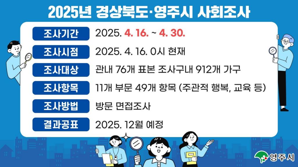 조사 기간은 4월 16일부터 30일까지 15일간이며 통계청이 표본으로 선정한 영주시 내 912가구의 가구주 및 만 15세 이상 가구원을 대상으로 한다. 조사원은 각 가구를 직접 방문해 면접 방식으로 설문을 진행하고 조사표를 작성한다.