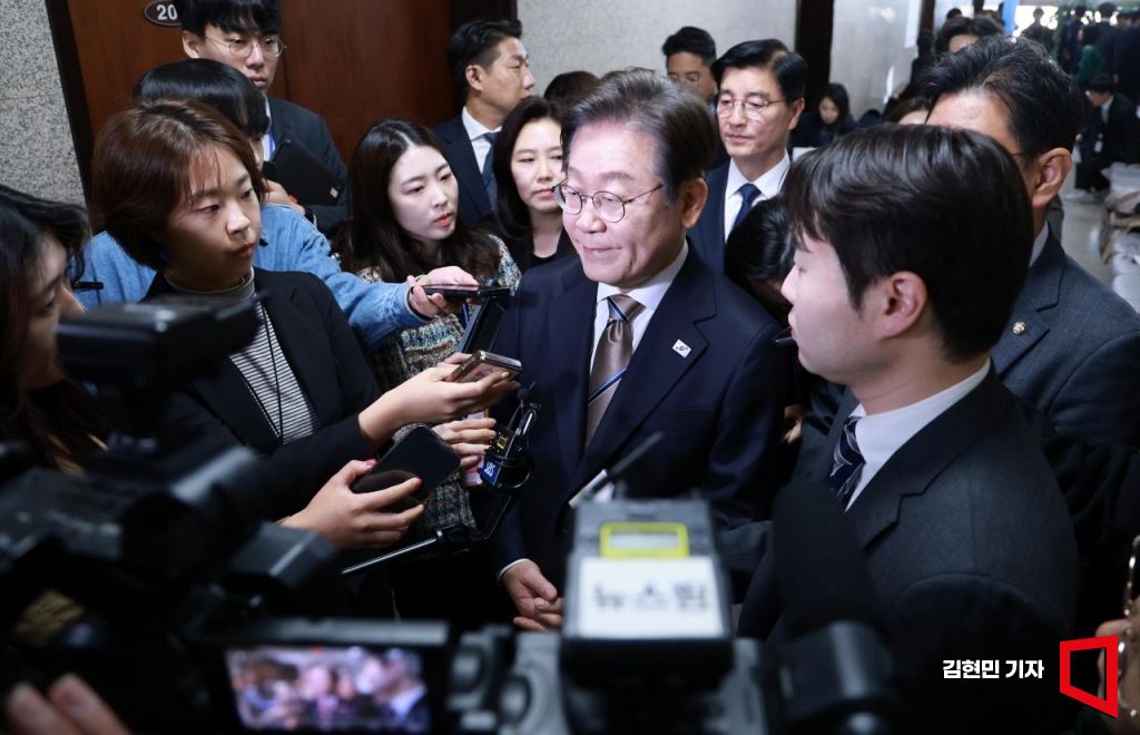 더불어민주당 대선후보 경선 주자인 이재명 전 대표가 16일 국회에서 열린 공명선거 실천 서약식을 마친 뒤 취재진의 질문을 받고 있다. 김현민 기자
