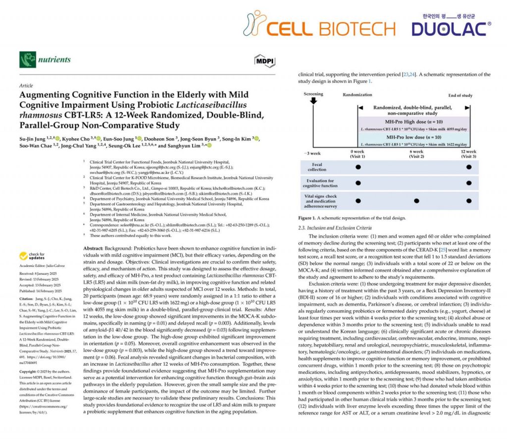 쎌바이오텍이 듀오락 주요 제품에 사용되는 특허 유산균 'CBT-LR5(KCTC 12202BP)'의 고령층 경도인지장애(MCI) 개선 가능성을 입증한 연구. 쎌바이오텍