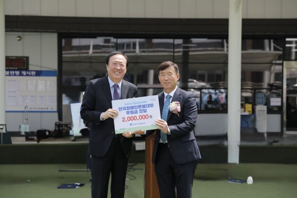 한민규 사학연금 상임감사(오른쪽)가 지난 16일 공승근 전남도장애인론볼연맹 회장에게 전국 장애인 론볼대회 성공적 개최를 위한 후원금을 전달하고 있다. 사학연금 제공