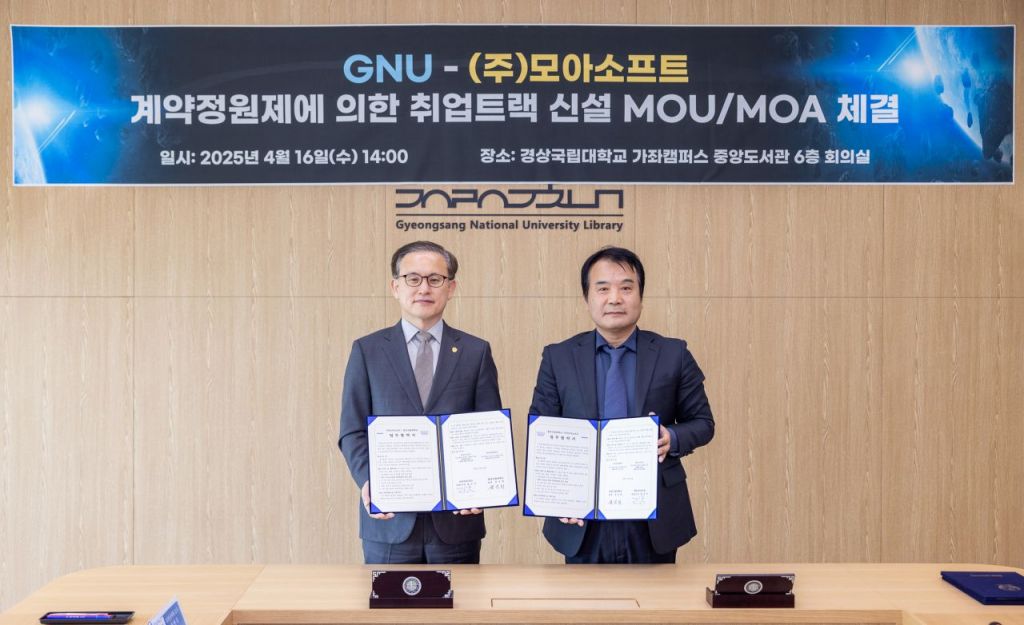 상국립대학교(GNU)와 ㈜모아소프트는 4월 16일 경상국립대 중앙도서관 6층 회의실에서 우주항공·방위산업 발전과 전문인력 양성을 위한 양해각서(MOU)와 계약정원제 기반 취업트랙 신설을 위한 합의각서(MOA)를 동시에 체결했다.<사진=경상국립대 제공>