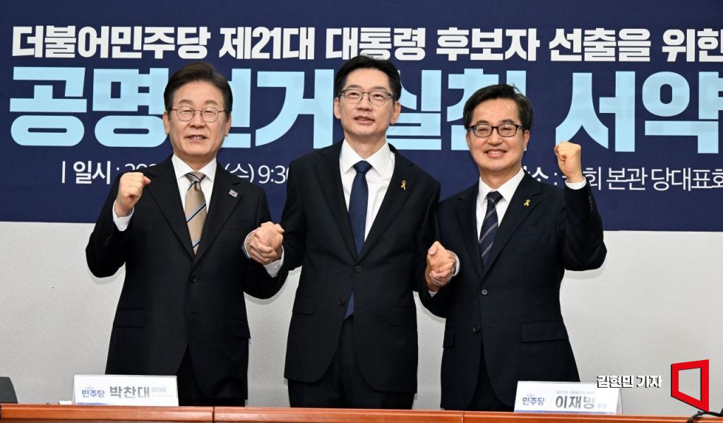 더불어민주당 대선후보 경선 주자인 이재명 전 대표(왼쪽부터), 김경수 전 경남지사, 김동연 경기지사가 16일 국회에서 열린 공명선거 실천 서약식에서 서약문에 서명한 뒤 기념촬영 하고 있다. 김현민 기자