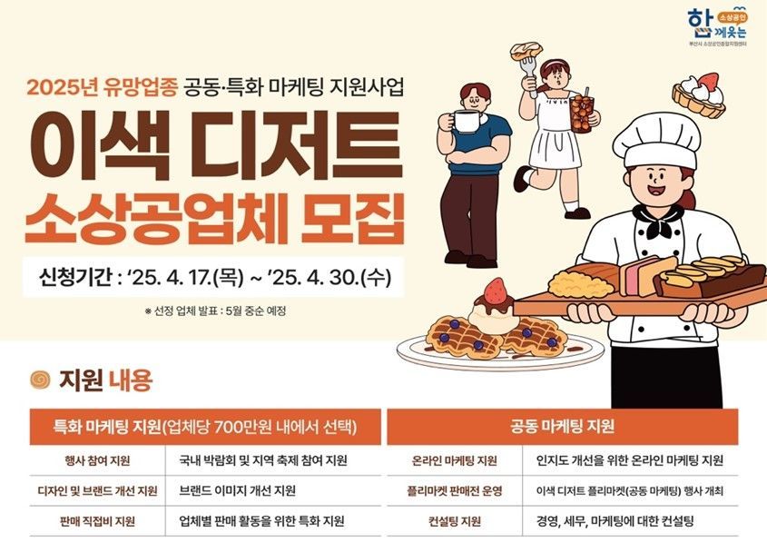 2025년 유망업종 공동·특화 마케팅 지원사업은 소상공인 유망업종을 발굴·선정해 온·오프라인 마케팅을 지원하고 업종의 동반성장을 이끌어 지역 특화 브랜드를 육성하기 위한 프로젝트이다. 부산의 대표 브랜드를 육성하기 위해 2017년부터 추진되고 있다.